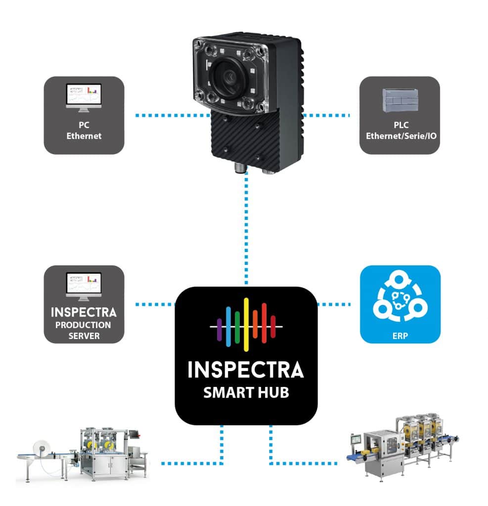 En cuanto a conectividad, estos equipos disponen del sistema INSPECTRA Smart Hub, permitiéndoles conectar con el ecosistema de producción de la planta del cliente. Su función es establecer una comunicación bidireccional entre los equipos Compact Smart Vision, los sistemas de gestión del cliente y otros equipos de la línea, para crear así un proceso de inspección y control de calidad totalmente automatizado.